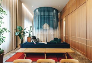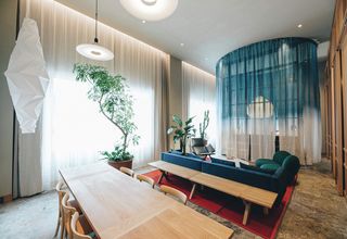 Gjesterommene har en sentral, transparent 4,5 m høy tekstil "sylinder" som stiger fra gulv til det høye taket.